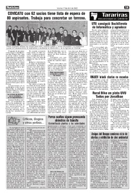cooperativistas trabajan- porque es un tema bas- tros integrantes, hay gen- sino que se financia y no La Unidad Local de urbanas de Tarariras. Se