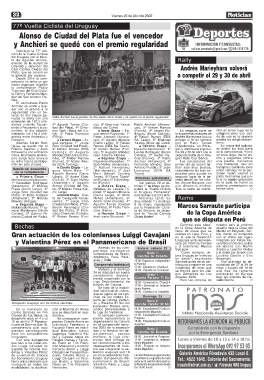 Presa (Cerro Largo), 3º ta), 5º Matías Presa (Ce- Ombúes de Lavalle-Tri- putará la "Vuelta Ciclista Tras la sexta se mante- tierras lusas.