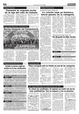 Nacional (Helvética) 2 - San Carlos (Colonia) 2 el rival fue Racing, cose- rers, Peñarol y Danubio Sub 14: Racing 6 - Pla- se coloca 14º con 27 pun-
