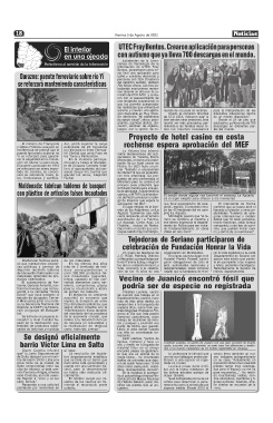 mando de voz para no lectores. Desde la comisión directiva de CEA AZUL indicaron que” si bien existen otras versiones, ésta resultó ser más abarcativa, per- mitiendo a las familias llevar to- dos los insumos necesarios Proyecto de hotel casino en costa rochense espera aprobación del MEF El predio donde alguna vez funcionó el camping La Aguada, es el lugar elegido para ofrecer a los inversores que lleve espectáculos de cate- goría”, explicó. El proyecto inclu- ye las 43 hectáreas del ex cam- ping La Aguada. Monzeglio precisó que “el te- rreno se vendería al oferente y ese dinero ingresaría al departa- mento de Rocha para ser volca- do fundamentalmente en obras viales en esa zona”. Tejedoras de Soriano participaron de celebración de Fundación Honrar la Vida organización en Montevideo. En el acto, que tuvo lugar en el Hospital Pereira Rossell, partici- paron delegaciones de todo el país, autorida
