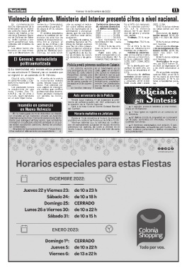 Se presentó la propietaria del local. Policía Cien- mismo horario, excepto el último día hábil de cada acato, lesiones personales y delitos vinculados a