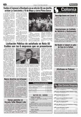 el asfaltado de la Ruta 83, aduaneros, inclusive del hoy viernes al domingo Casa de la Cultura y ac-