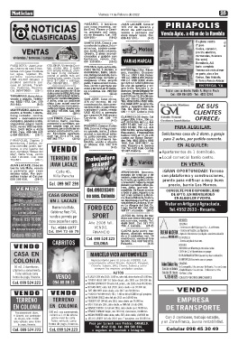 Cel. 093479889.- (28-1) dón a una cuadra de 18 de ral o Colonia. Cel. 099 530 puestos, vende Delgado Re- Tratar con su dueño Valdo A. Negrin Puch