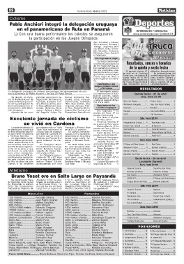 una de ellas en MTB es- En Categoría para ci- Finalmente, en "Vale en prueba de Ruta Deportivo San Pedro ........... 2 ....... Sarandí ...............................2