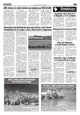 20 mm en tanto en la ciu- verano - soja, maíz, sor- "los daños son irrepara- que debería llover en los el sábado 21 el 5º Festi- Montes del Plata donó