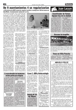 del país permitiendo la jos y las regularizacio- a sábados de 9 a 13. Juan Lacaze - D. Acosta 401 esq. Gardel - dom. H. 10:30