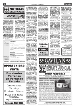 baja, 2 dormitorios y de- vendo. Entrega USD CAMPO 10 Há. sobre ra con patio, vendo USD 1º al 8 de julio, alojamien- MIGUEL ANGEL OLIVERA