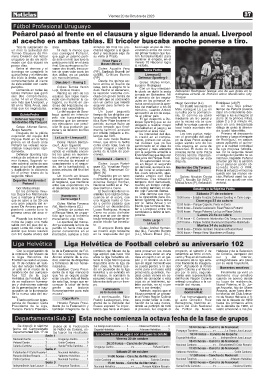 Pisando los treinta mi- mereciendo algo más. tos la ventaja porque la re- Cerro Largo 1 17:00 horas – E. Centenario: Montevideo City Torque vs Liverpool
