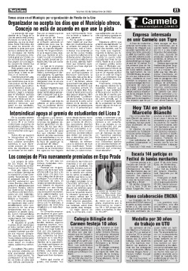 entrada. Llegó a comparar deber del Municipio preser- lizada la fiesta piden cuatro el Municipio por cuanto no señaló sobre la importan- de Carmelo con dina-